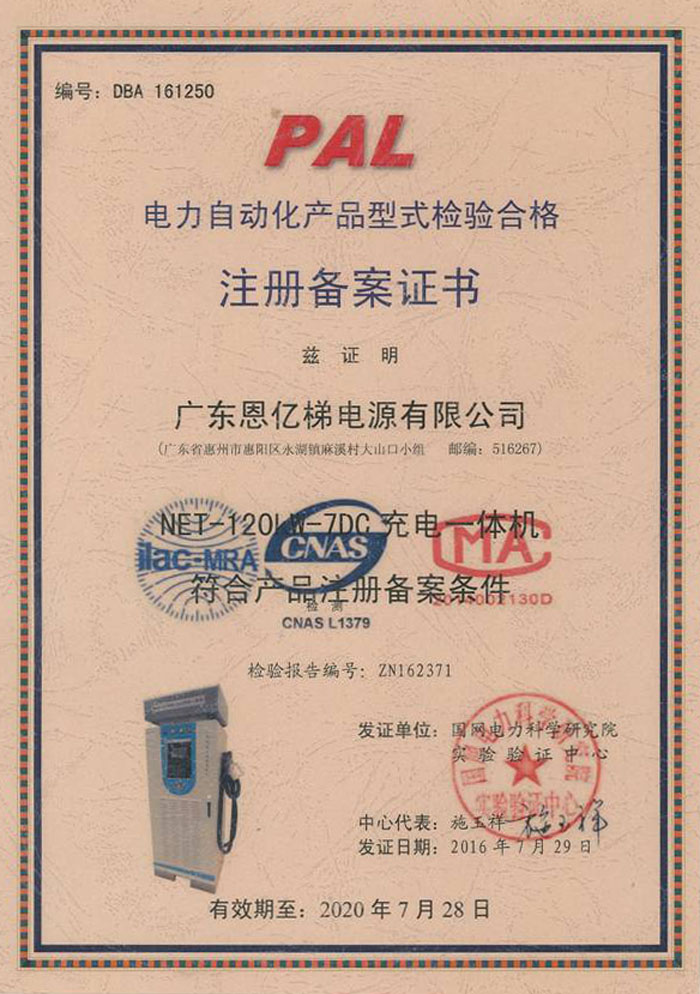 電力自動(dòng)化產(chǎn)品型式檢驗(yàn)合格注冊(cè)備案證書(充電一體機(jī))